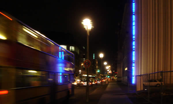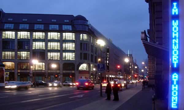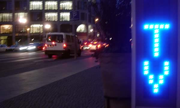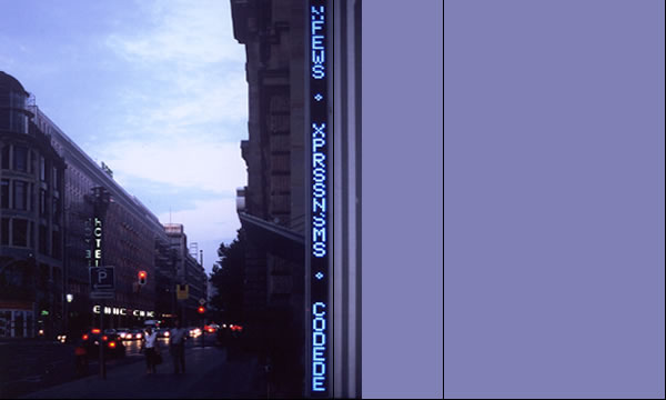 Ein Textgedicht in 8 Zeilen visualisiert als durchlaufender Informationsstrom Worte und Begriffe aus der Welt der Kommunikation . Die vertikale LED-Matrix, die sich wie eine Nervenfaser den urbanen Stadtraum erobert, laeuft als Dauerloop . Die Worte kommen und gehen, klettern die Brandwand empor und verschwinden so schnell wie sie gekommen sind . Gleich unseren Gedanken werfen sie Schatten ins Gedaechtnis und vertreiben Zeit und Raum. CYBERLIN AT INTERNET KOMMUNIKATION 1NE 0ERO 1NE 1NE 7EVEN NETZHAUTAUTOMATIKION