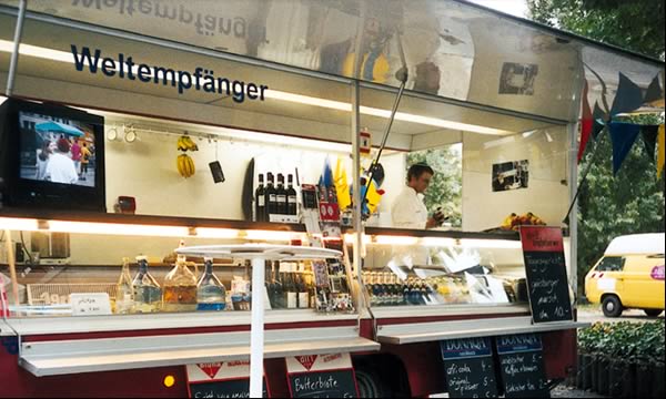 2001 . ART FICTION 1 . Mit der Raumstation WELTEMPFAENGER dockten wir (Dida Zende, Ulrich Kraus, Bruno Nagel) am Mutterschiff ART FORUM BERLIN 2001 an . WELTEMPFAENGER . Der Imbisswagen als Raumstation . Entnimmt man einer Rauminstallation die Worte IN und ALL bleibt als Ergebnis das Wort Raumstation . IMBISS_INALL . Nun ist die Raumstation sowohl vom Raum umgeben, als dass sie auch selbst als Raum in Erscheinung tritt . Der Imbisswagen ist also Herberge und Aufenthaltsort fuer Reisende in unendlichen Weiten . Diese Verkettung von grosser und kleiner Welt ist somit auch Loesungsvorschlag fuer galaktisches Denken . ES NIMMT KONTAKT AUF . > Astronauten, die in der Schwerelosigkeit das Gefuehl fuer oben und unten verloren haben, koennen einander helfen, indem sie sich unter die Fußsohlen klopfen . Die Oben-Unten-Orientierung rastet wieder ein . Umgekehrt koennen sich die Astronauten gegenseitig aergern, indem sie sich auf den Kopf klopfen: Schon steht die Welt wieder verkehrt herum . Das selbst ist demnach kein Ding in der Welt, sondern ein Prozess, metaphorisch: eine Illusion < (aus Tagesspiegel) |