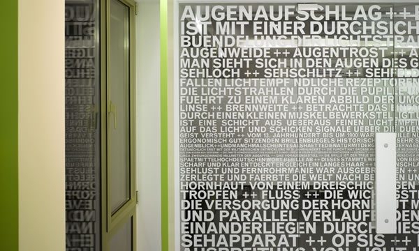 Die Glasfassade zu den Refraktionsraeumen ist mit einer Textinstallation
